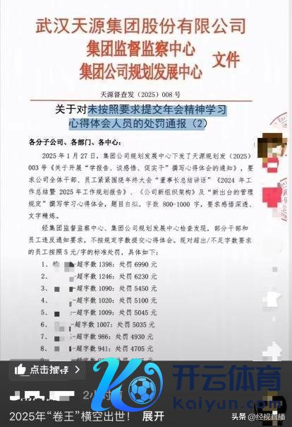 近日,有网友发文称,武汉一公司因职工未按照条件提谈心多礼会,而被通报处罚。公司发布的文献称,职工牢牢围绕年终大会"董事长记忆语言"撰写学习心多礼会,字数 800-1000 字,条件感悟深透开云体育(中国)官方网站,笔墨简陋。经公司查验发现,部分干部、职工违背条件,不按章程字数提谈心多礼会,现对超出 / 不及字数条件的职工按照 5 元 / 字的圭臬处罚。记者看到,处罚通报中,有职工超字数 1398 字被处罚 6990 元,还有职工因与其他职工有叠加实质 342 个字,处罚 1710 元。不外,通报终末暗示,本着"教诲为主,惩前毖后"的原则,对上述东谈主员从轻处罚,超出 200 元的调理按 200 元圭臬处罚。