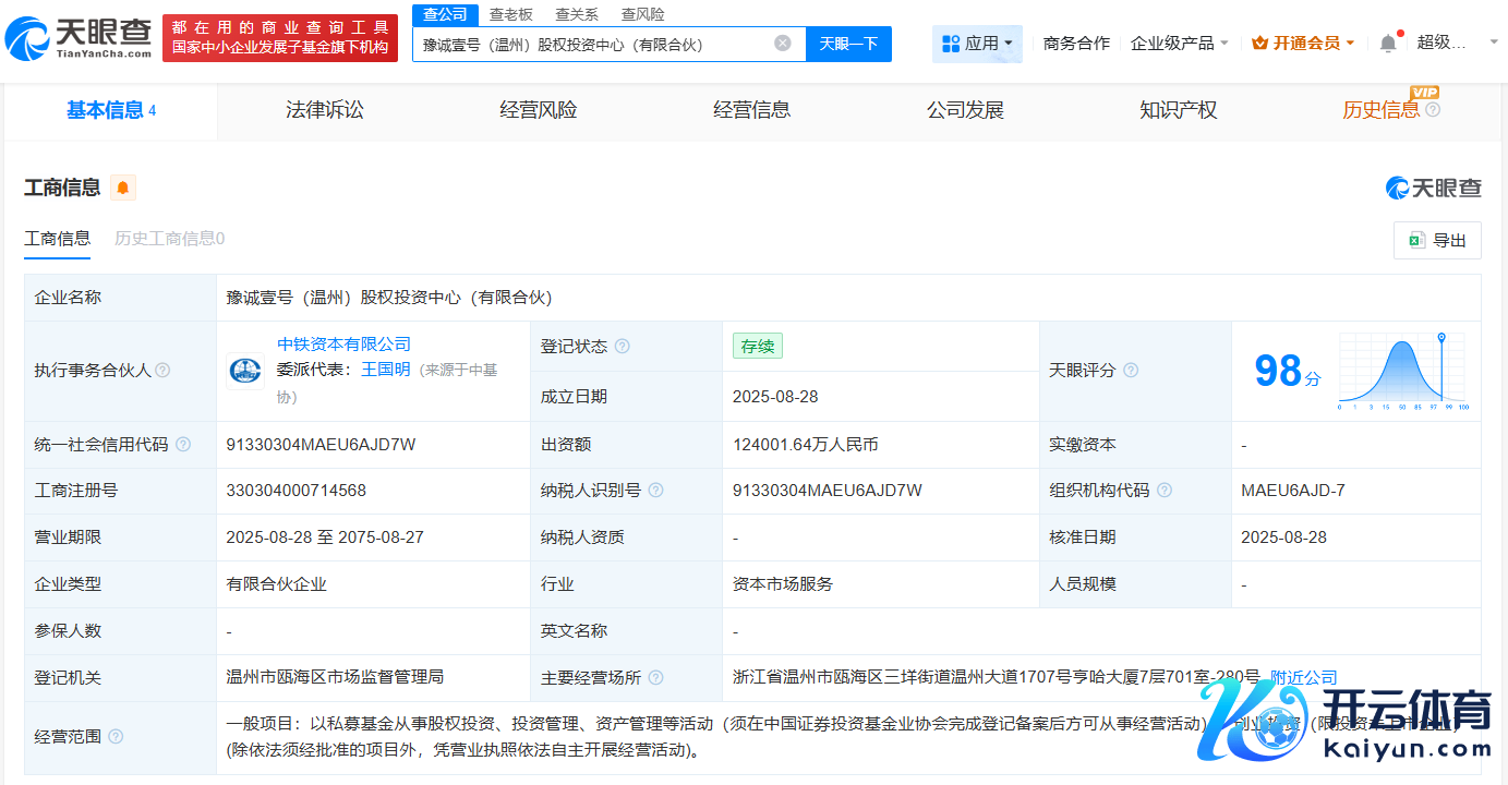 南边财经9月3日电,天眼查工商信息显露,近日,豫诚壹号(温州)股权投资中心(有限联合)缔造体育游戏app平台,实行事务联合东说念主为中铁老本有限公司,出资额约12.4亿东说念主民币,商酌范围包括创业投资,以私募基金从事股权投资、投资处罚、金钱处罚等看成。联合东说念主信息显露,该企业由北京资信通机械租出有限株连公司、中铁老本有限公司共同出资。