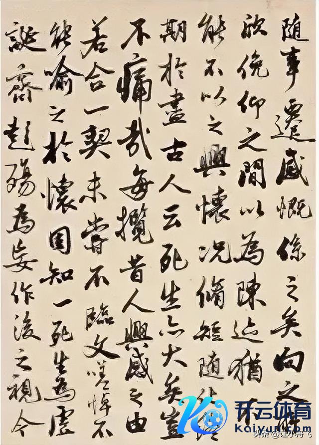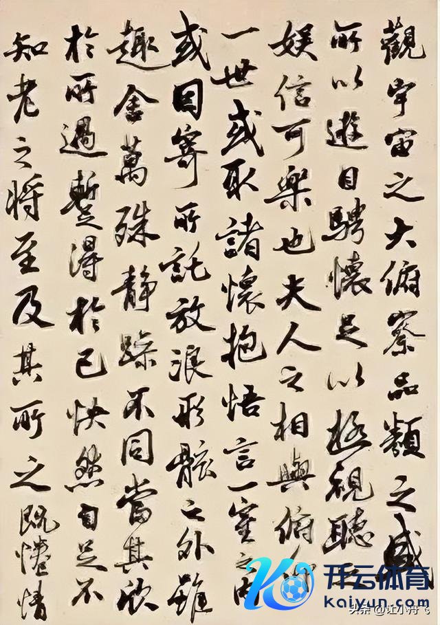 章法,杂乱有致,阵容连贯。比原帖更显疏朗,字与字、行与行之间相干无邪,大小、枯润、纵横、倚正互相衬托。形断势联,虽字字颓唐却睥睨多情,行笔节律明快,如长风开阔、骐骥驰骋,不成羁勒。字据《兰亭序》文本情谊升沉诊疗章法,"向之所欣"等段落更显奔放,"悲夫"处则见千里郁抑扬。虽变化丰富却不结怨谐同一,在杂乱中求均衡,于变化中见举座,体现其深厚艺术功底。